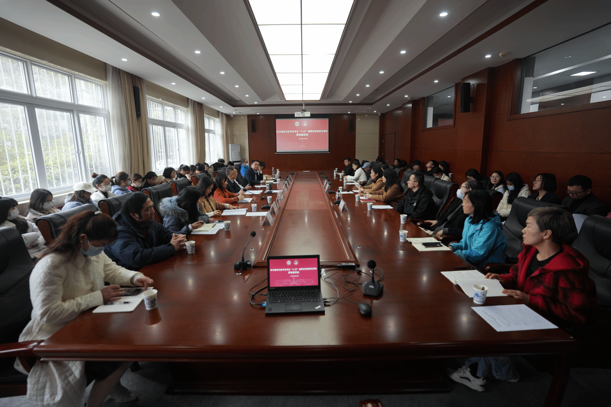3月18日,为纪念习近平总书记3·18重要讲话五周年,深入学习贯彻习近平新时代中国特色社会主义思想,推动思政育人工作高质量发展,总结部署学校思政课改革创新工作,学校召开学习贯彻习近平总书记“3.18”重要讲话精神五周年师生座谈会暨“纺大思语”论坛。学校党委副书记、副校长罗锦银,武汉大学弘毅特聘教授项久雨,中国地质大学(武汉)william威廉亚洲官方二级教授韩美群出席座谈会,william威廉亚洲官方全体思政课教师及研究生代表参加座谈会。学校党委宣传部常务副部长、新闻中心主任刘戈主持会议。