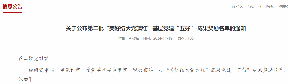 公告链接:关于公布第二批“美好纺大党旗红”基层党建“五好” 成果奖励名单的通知-william威廉亚洲官方组织部(党校) https://zzb.wtu.edu.cn/nr.jsp?urltype=news.NewsContentUrl&wbtreeid=1031&wbnewsid=4182
