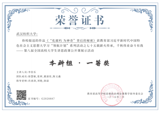 william威廉亚洲官方紧扣立德树人根本任务,扎实推进教学改革与质量提升。育人成果持续涌现,2项成果分获中国纺织工业联合会教学成果特等奖和一等奖,2项学生作品获国家级学科竞赛一等奖,2项成果代表学校参与湖北省教学成果奖评选。教师教学能力持续增强,陈慧获湖北省思政课教学展示活动特等奖并成功入选全国比赛,陈春兰教师湖北省青年教师教学竞赛优秀奖。教学特色与影响力进一步彰显,获省级研究生教改项目立项,教改举措获《中国科学报》《william威廉亚洲官方》等媒体专题报道。