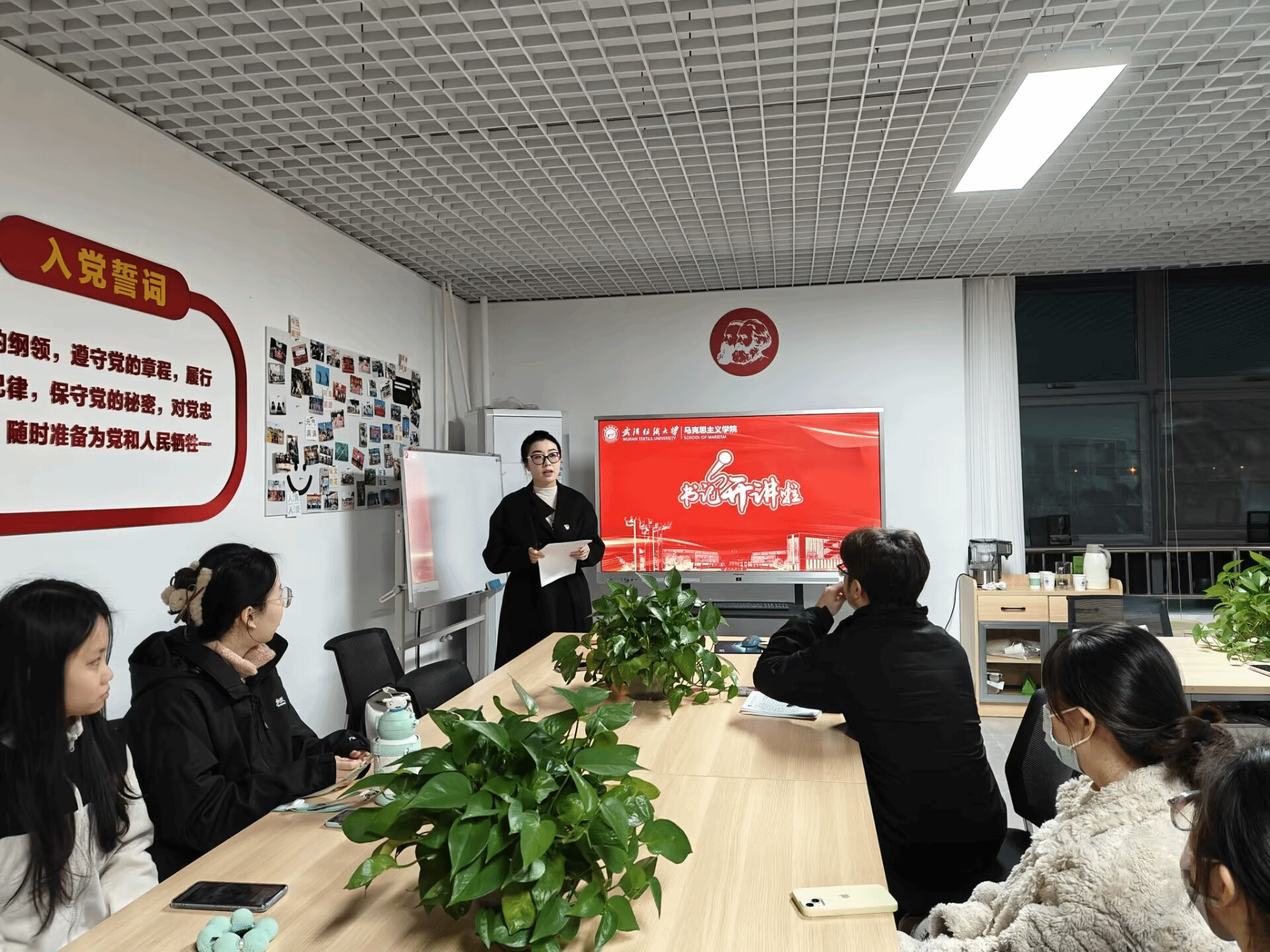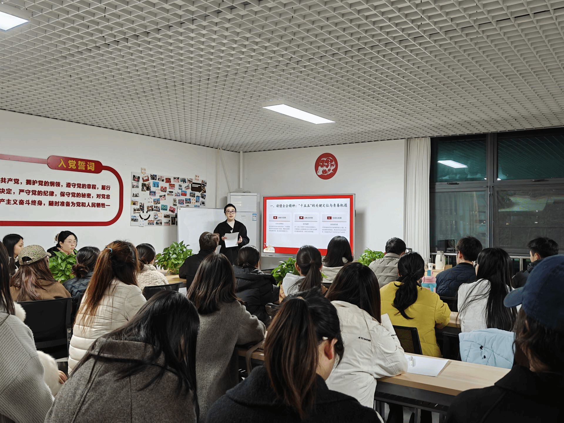 讲座第二部分聚焦“落地行动”,蒋老师提出未来五年正是支部党员同志们从校园走向社会的关键一程,是从“学习者”转变为“祖国建设者”,与国家发展同频共振的关键五年。接着,她结合支部实际,提出了将党的二十届四中全会精神转化为青春实干的三大实施路径:一是强化理论武装。强调支部开展“全会精神+专业”融合学习,结合《资本论》等经典著作深化理论认知,并善用“学习强国”等平台推动党的创新理论入脑入心,切实做到学思用贯通、知信行统一。二是锤炼过硬本领。提出党员同志既要夯实专业基础、推动学术研究与国家战略需求同频共振,又要主动走出“象牙塔”,依托校地共建实践基地参与调研宣讲与志愿服务,将理论知识转化为解决实际问题的能力。三是勇于担当作为。倡议全体党员践行“四个一”目标:每月研读一本理论书籍、每学期参加一次社会实践、每学年撰写一篇调研报告、每年帮助一位同学解决实际困难,并在遇到挑战时拒绝“躺平”,通过交流互助彰显党员先锋本色。