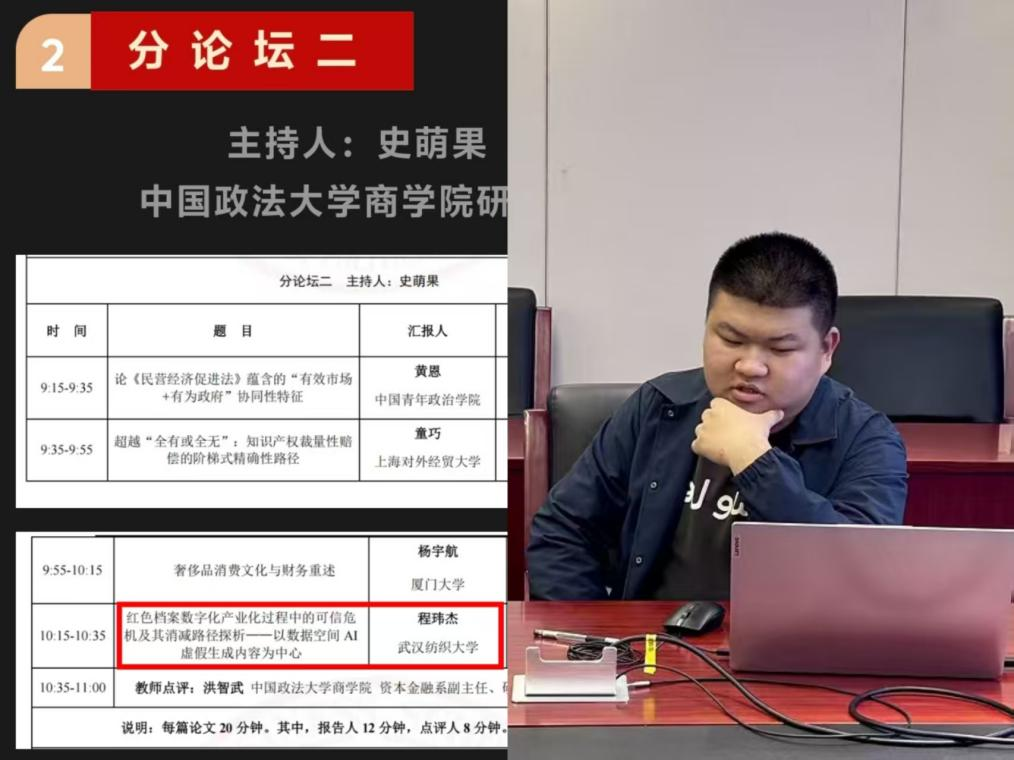 在上午的第二分论坛上,程玮杰以《红色档案数字化产业化过程中的可信危机及其消减路径探析——以数据空间AI虚假生成内容为中心》为题做学术交流。他提出要以可信数据空间开发红色档案,确保红色档案数据真实有效,通过技术框架、多元共治、精准追责、分类分级管理的方式提高红色档案数据的可信管控能力,发挥好红色档案资政助研育人的时代价值。