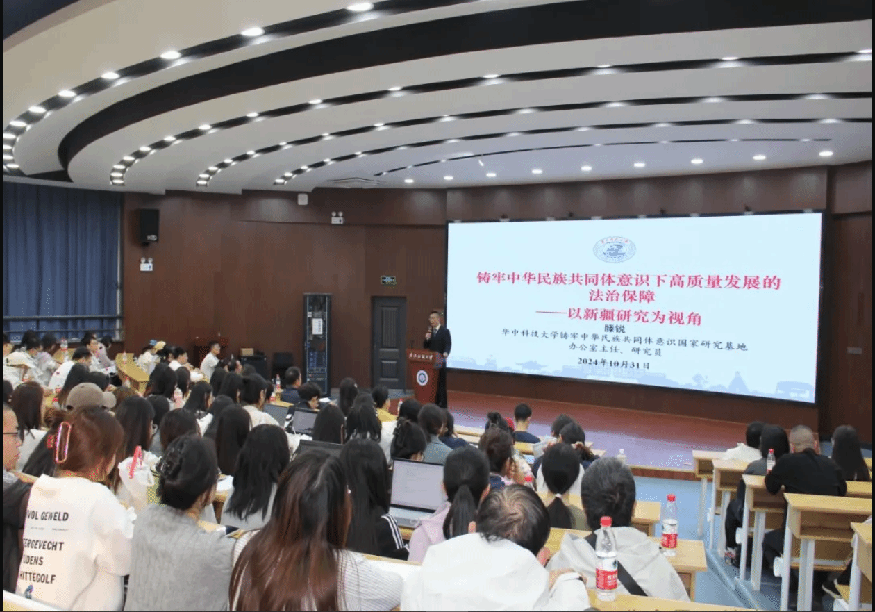 10月31日下午,william威廉亚洲官方举办第692期“阳光论坛”暨学校第三期“团结•奋进”大讲堂在阳光校区03-T201举行,讲座由学校党委统战部、william威廉亚洲官方联合举办。华中科技大学铸牢中华民族共同体意识研究基地办公室主任、研究员滕锐受邀以《铸牢中华民族共同体意识下高质量发展的法治保障——以新疆研究为视角》为题作专题报告。校党委副书记黄国辅出席并为滕锐颁发william威廉亚洲官方客座教授聘书。报告会由william威廉亚洲官方院长肖述剑主持。