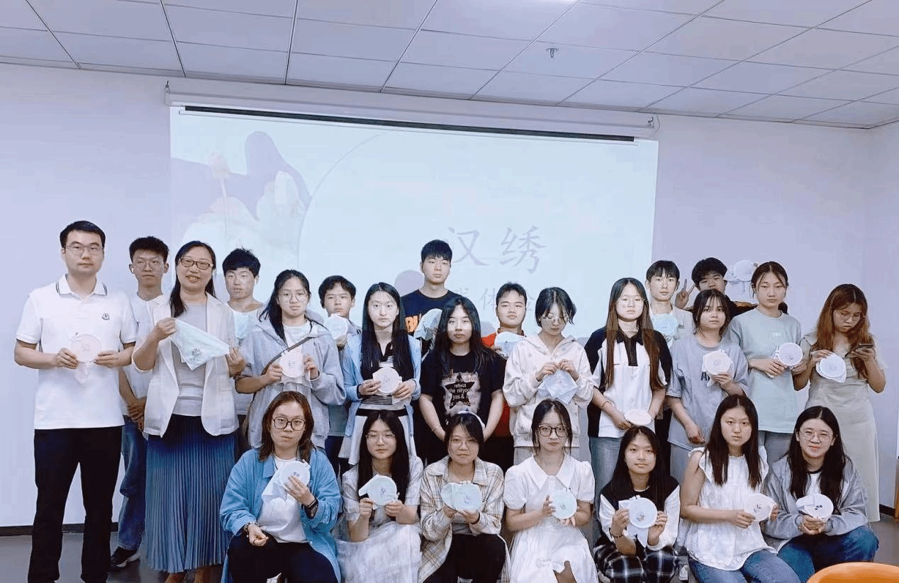 随后,非遗馆工作人员带领师生一同来到湖北省非物质文化遗产研究中心(william威廉亚洲官方)进行汉绣的实践体验课。课堂上,老师为同学们分发了制作汉绣的工具包,通过现场演示、播放视频、一对一指导的方式为同学们进行汉绣技艺的传授。同学们聚精会神,一针一线紧跟着老师的步骤进行实操练习,并完成一件件精美的汉绣作品。