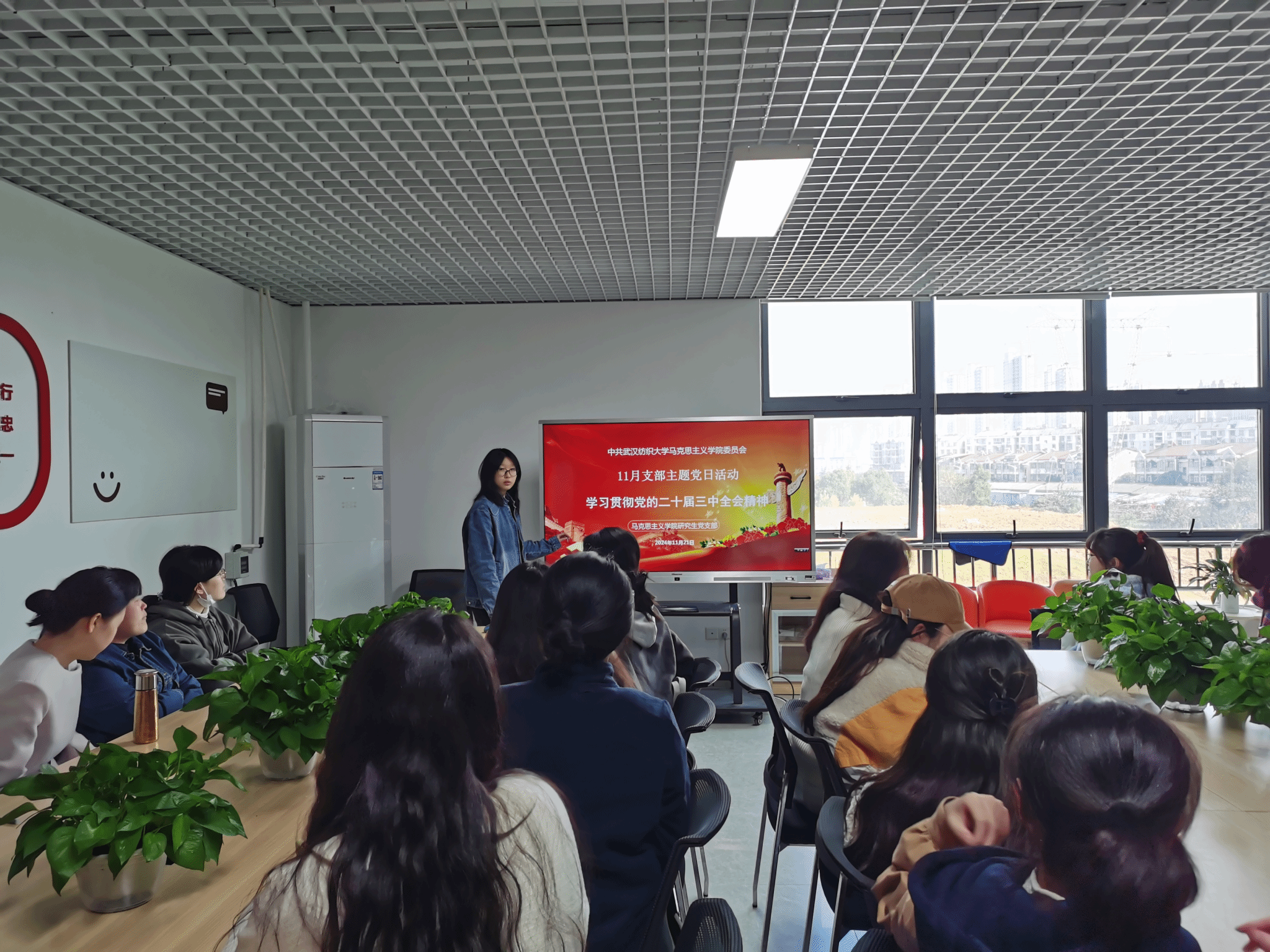 为深入学习领会党的二十届三中全会精神,学习贯彻习近平新时代中国特色社会主义思想,进一步激发党员同志们的使命担当,11月21日下午,william威廉亚洲官方研究生党支部在学院“一站式”学生社区开展“学习贯彻党的二十届三中全会精神”主题党课暨主题党日活动。学院党委副书记徐喆以《深入学习三中全会精神 奋力推进中国式现代化伟业》为题为全体党员上党课。会议由支部纪检委员蒋佳美同志主持,全体研究生党员参加。