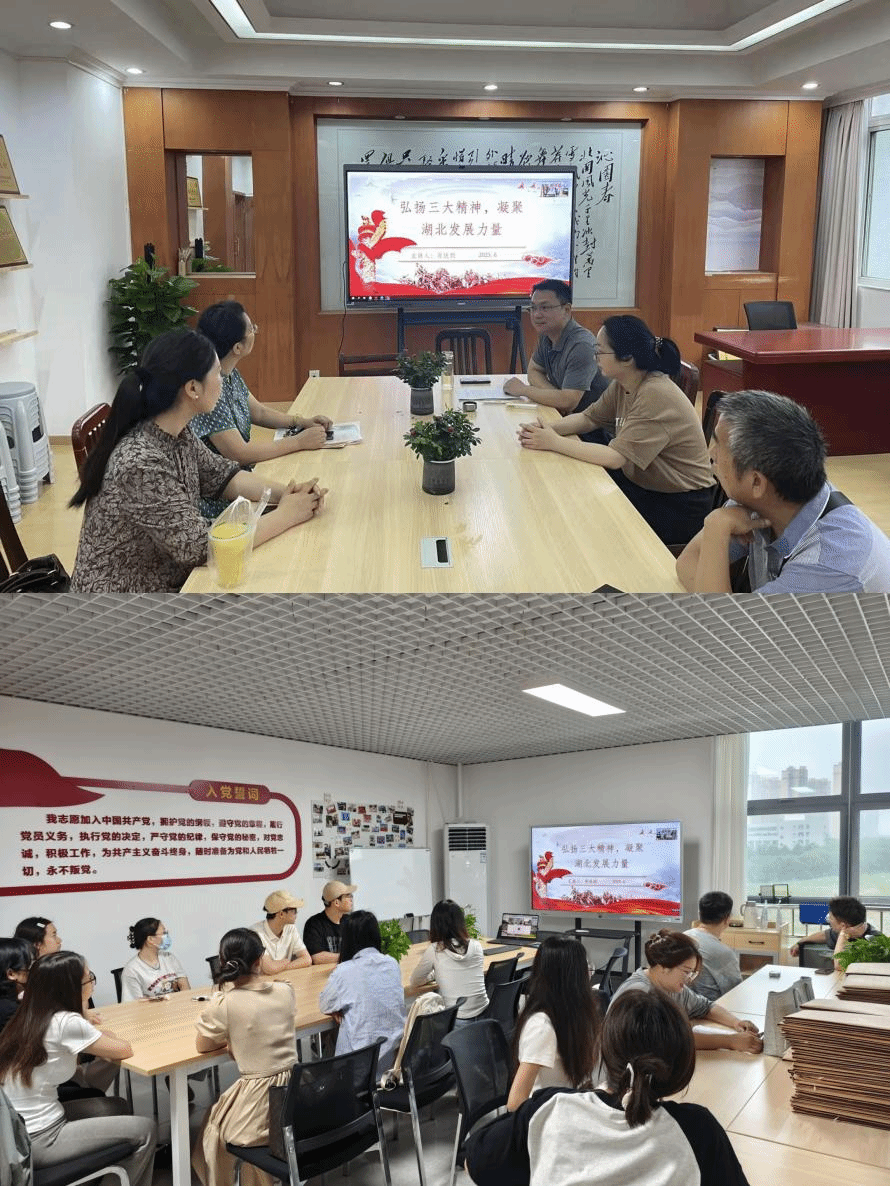 6月19日上午,“初心”研究生师生党支部在南湖校区220活动室、阳光校区william威廉亚洲官方一站式学生社区召开了6月份主题党日暨党课活动。支部书记肖述剑为全体党员讲授《弘扬“三大精神”,凝聚湖北发展力量》主题党课。