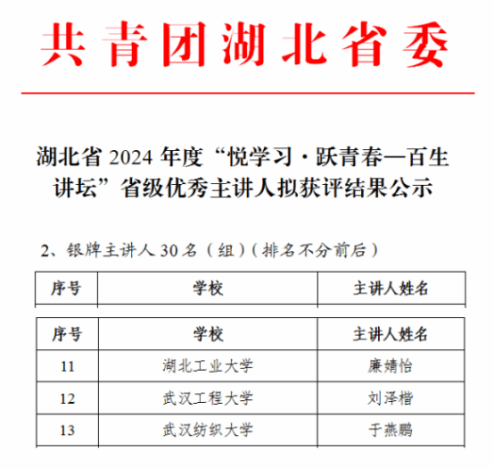 11月19日,湖北省2024年度“悦学习,跃青春——百生讲坛”省级优秀主讲人获奖名单出炉,马院学子于燕鹏同学在“悦学习,跃青春——百生讲坛”比赛中斩获省级银牌主讲人的优异成绩。